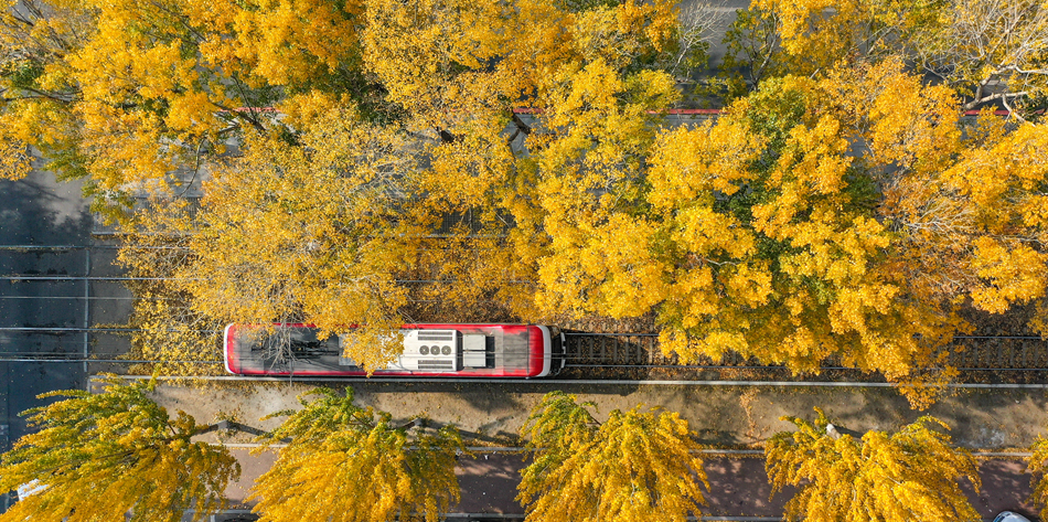 2023年10月24日,一辆电车行驶在长春市春城大街(无人机照片)。新华社记者 张楠 摄