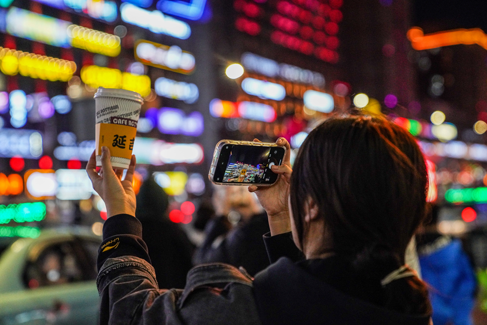 游客手拿咖啡在延吉市打卡拍照。新华社记者 颜麟蕴 摄