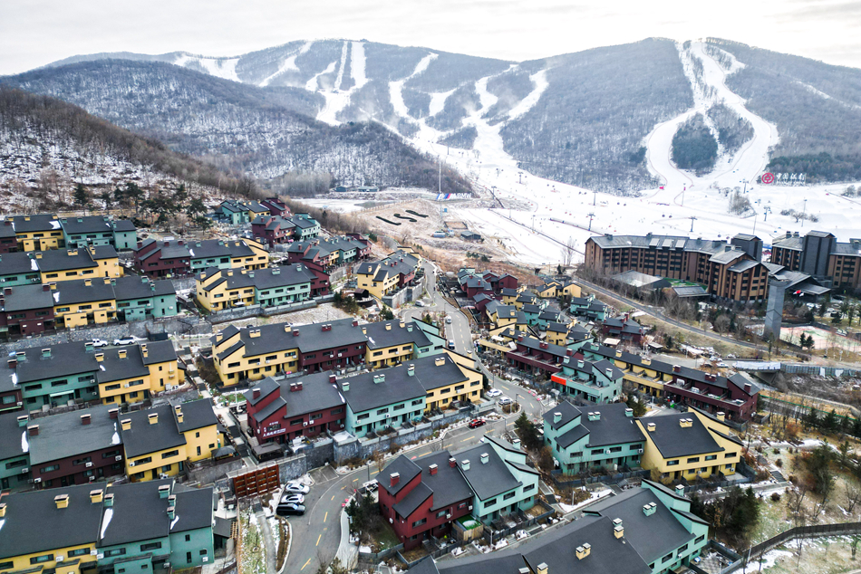 2023年12月14日拍摄的吉林省吉林市万科松花湖度假区滑雪场及度假小镇(无人机照片)。新华社记者 许畅 摄