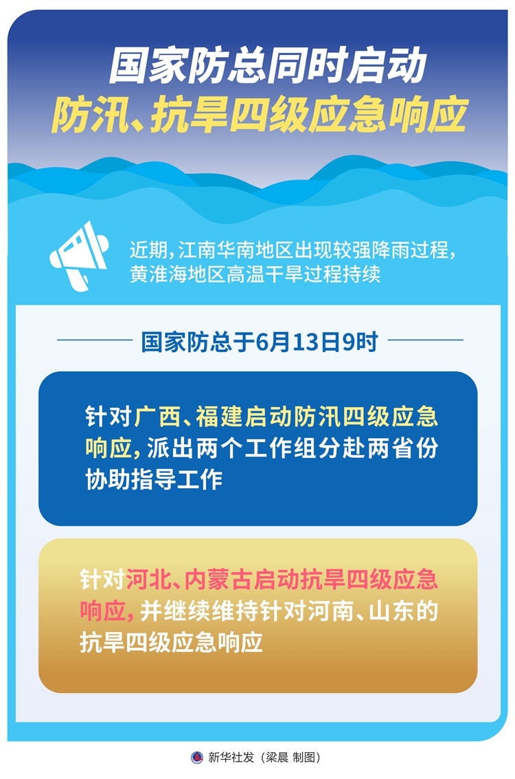 新华社北京6月13日电(记者 周圆)近期,江南华南地区出现较强降雨过程,黄淮海地区高温干旱过程持续。国家防总于6月13日9时针对广西、福建启动防汛四级应急响应,派出两个工作组分赴两省份协助指导工作;针对河北、内蒙古启动抗旱四级应急响应,并继续维持针对河南、山东的抗旱四级应急响应。