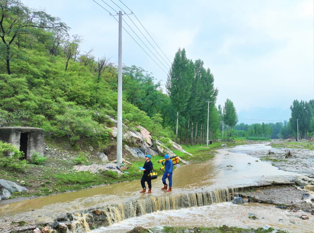 石家庄市电力工人对山区跨河道线路进行巡视检查。新华社记者 王昆 摄