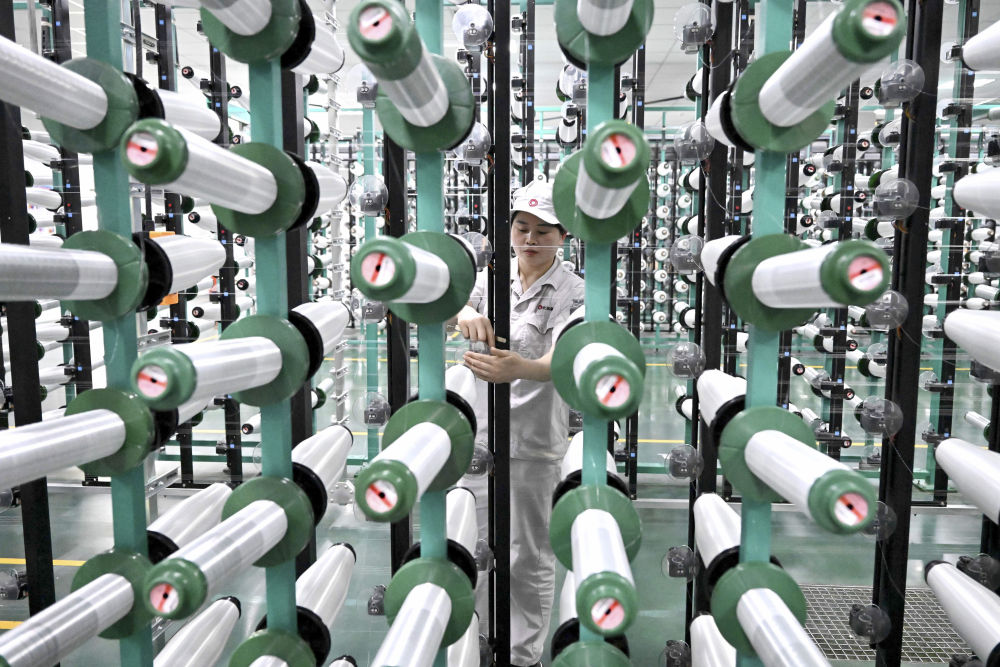 2月22日,在位于河南安阳林州市的河南光远新材料股份有限公司电子布准备车间,工作人员在检查整经机机台。新华社记者 李安 摄