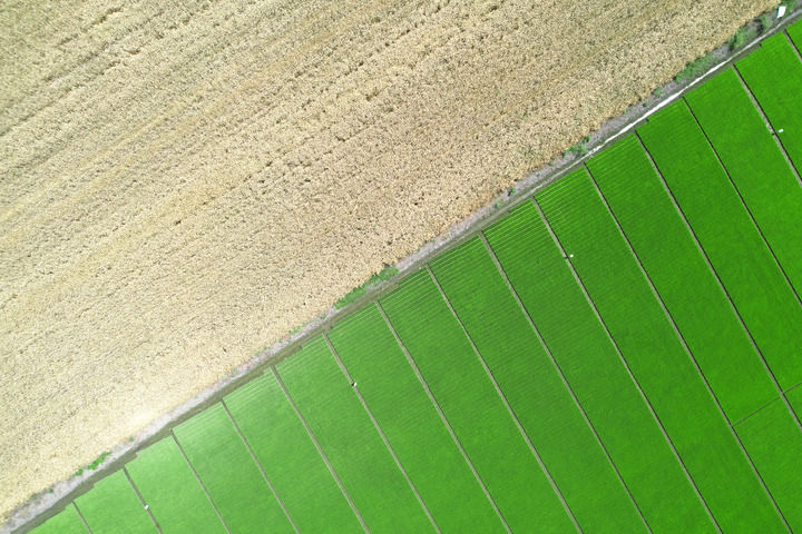 2024年5月13日在四川省广汉市国家现代农业产业园拍摄的成熟小麦田块(左上)和水稻育秧场(右下)(无人机照片)。新华社记者 杨进 摄