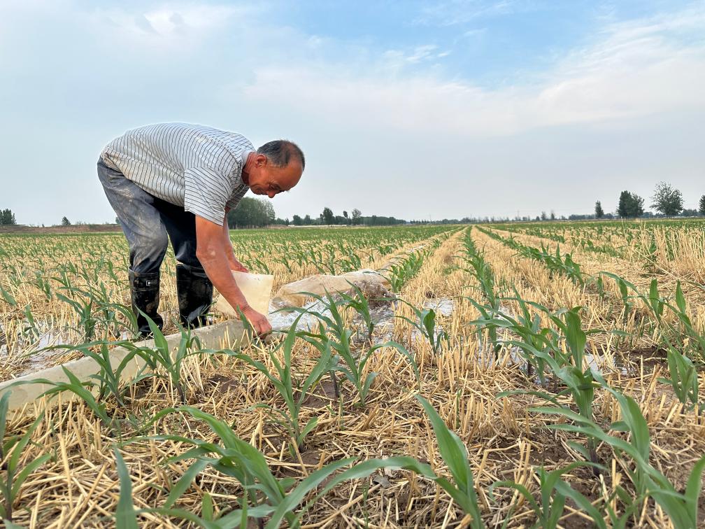 6月18日,在山东省菏泽市巨野县麒麟镇一处农田,农民江福华在灌溉玉米。新华社记者 王阳 摄