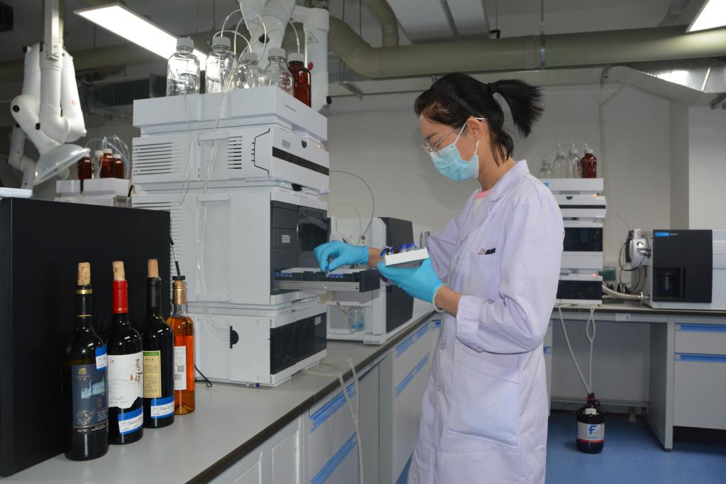 国家葡萄酒产品质量检验检测中心(宁夏)工作人员正在对葡萄酒产品进行检验检测。新华社发