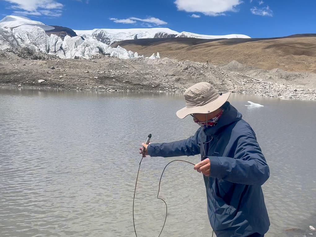 工作人员在措嘉冰川的前缘冰湖收集水位数据(6月23日摄)。新华社记者 邱星翔 摄
