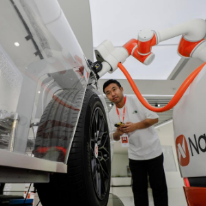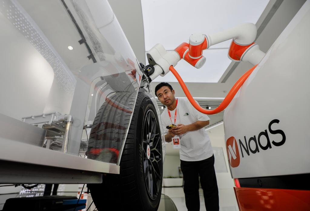 工作人员正在调试能链智电充电机器人。(受访者供图)