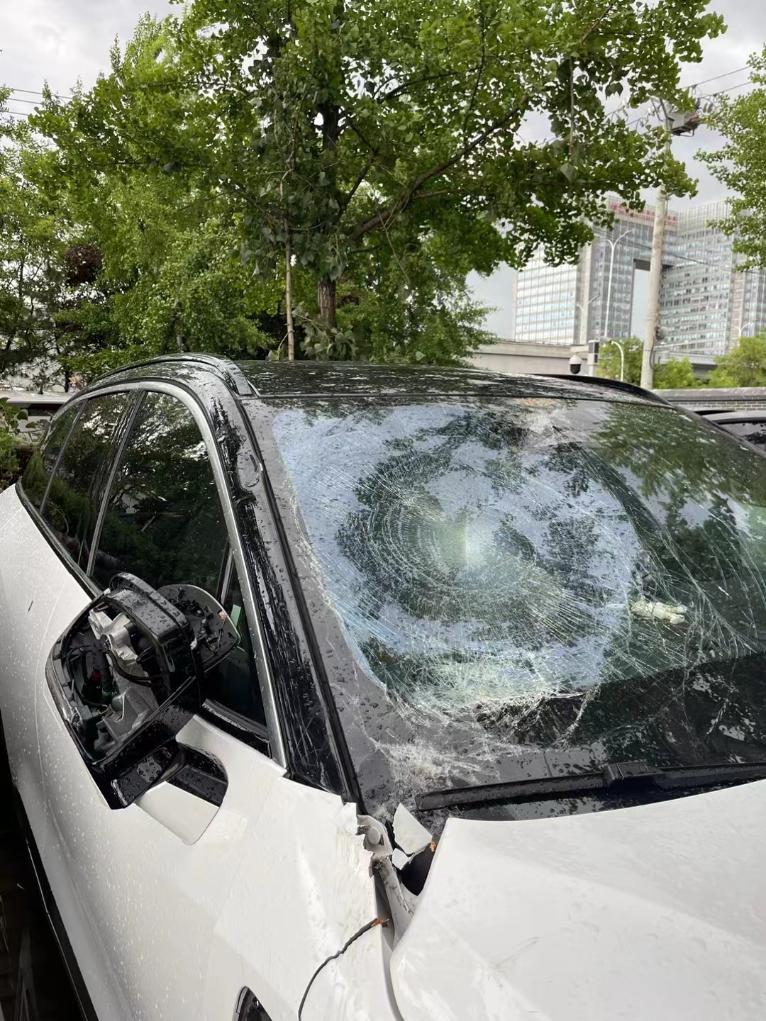 北京市民张先生的车辆在一次较强雷雨天气中遭树木砸毁(5月30日摄)。新华社发