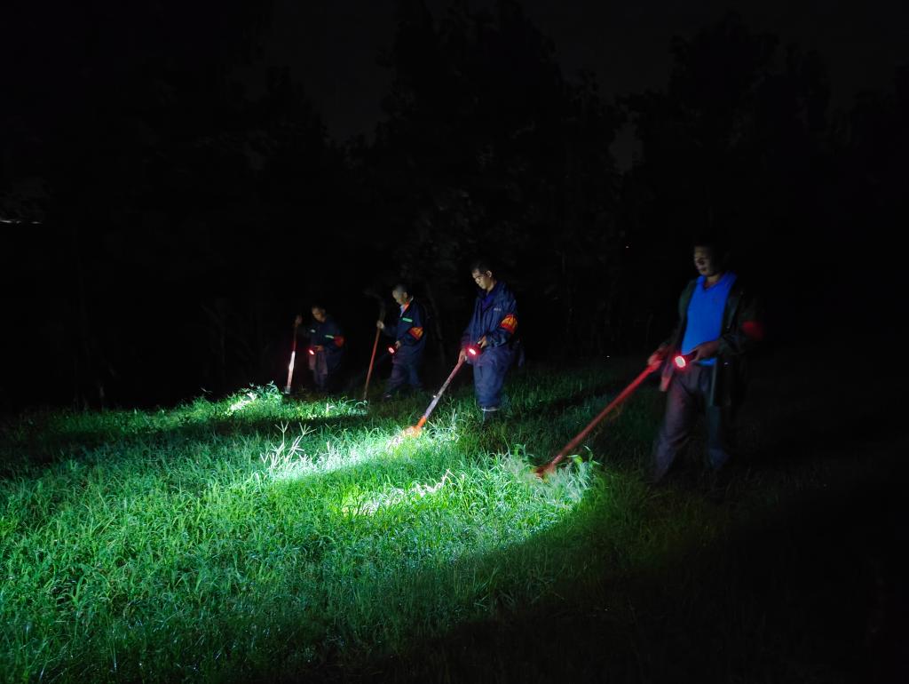 深夜里,黑漆漆的坝坡,一道道光柱由远及近,连成一片,一群穿着胶靴的人正一手举着手电筒,一手把着铁锹,埋着头并排走在草丛里。