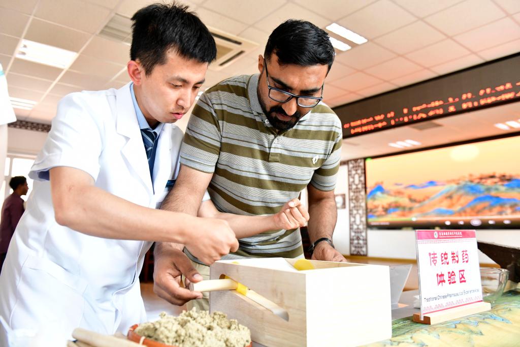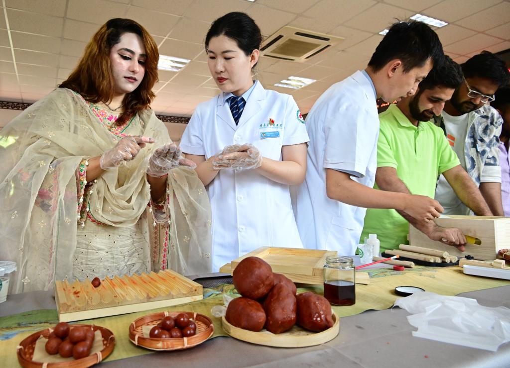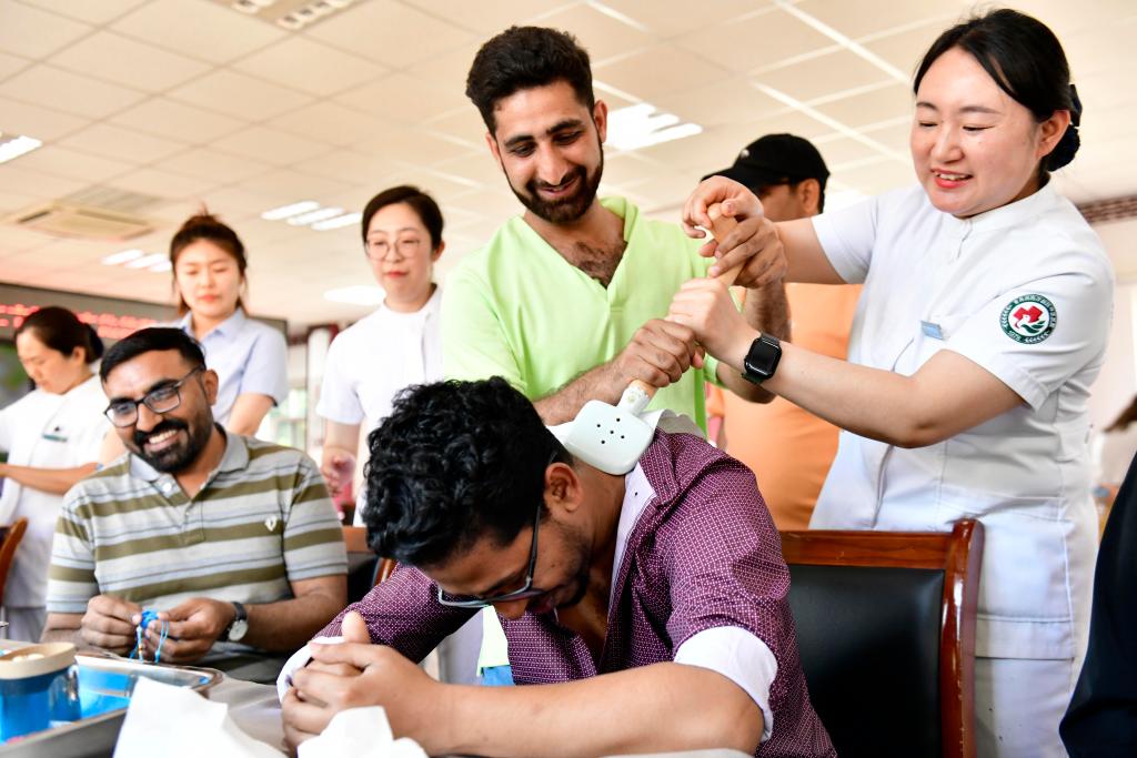 近日,青岛西海岸新区中医医院和青岛大学联合举办国际学生中医药文化体验活动,来自巴基斯坦、印度、孟加拉国、阿富汗等国的20名留学生体验了中医养生功法五禽戏。大家还体验了拔罐、推拿、刮痧、艾灸、中药材鉴别等中医药项目,品尝中药茶饮、药膳,学习制作中药香囊。
