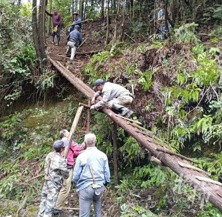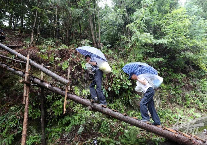 6月25日,运输队的成员们背着30到60斤不等的物资,徒步往返约十公里,沿途多处树木倒伏,古道泥泞崎岖,路窄且陡,稍有疏忽就可能失足跌倒。原本开车十几分钟的路程,他们靠双脚翻过三个山头,足足走了一个半小时。