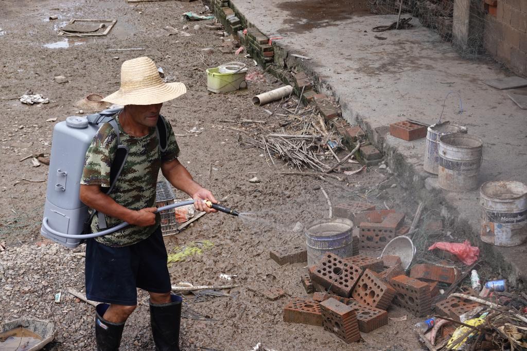 7月4日,在湖南省张家界市永定区西溪坪街道禾家村,村民在进行消杀作业。新华社记者张格 摄