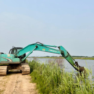 左边是一眼望不尽的稻田,右边是一眼望不尽的水面,中间是一条4米左右宽的河堤。一辆辆挖掘机正在不断地加固河堤,水面距离堤顶只有几十厘米,且水位还在上涨。