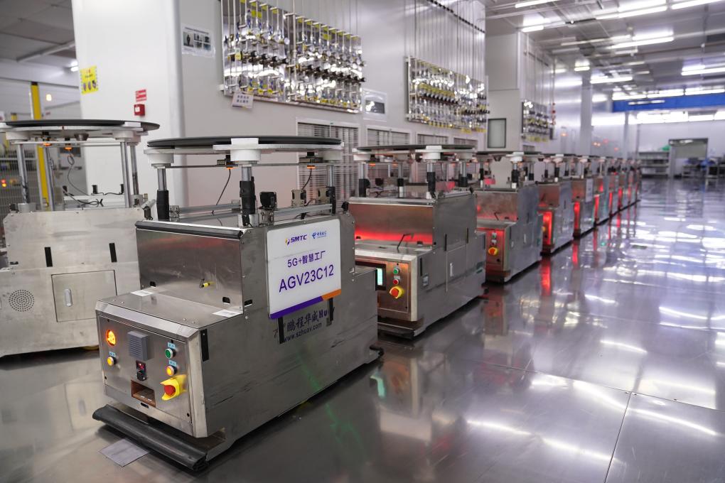 6月4日,在位于江西省南昌市高新区的江西兆驰半导体有限公司外延车间,AGV自动转运小车在5G技术支持下进行自动搬运。新华社记者 周密 摄