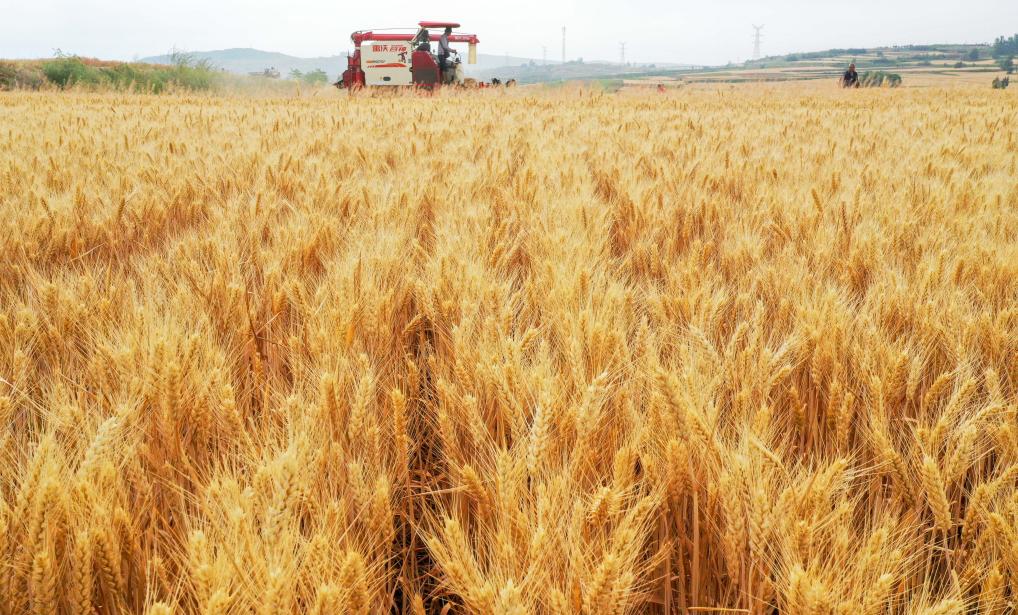 5月27日,收割机在河南省洛阳市新安县铁门镇的麦田里收获小麦。新华社发(张怡熙摄)
