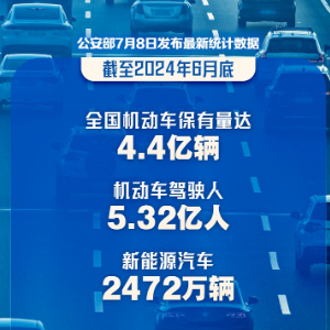公安部7月8日发布最新统计数据,截至2024年6月底,全国机动车保有量达4.4亿辆,其中汽车3.45亿辆;机动车驾驶人5.32亿人,其中汽车驾驶人4.96亿人。2024年上半年全国新注册登记机动车1680万辆,新领证驾驶人1397万人。