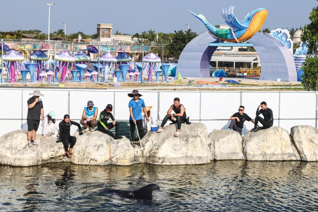 1月21日,蓝丝带海洋保护协会的志愿者在三亚海昌生物保育中心清理异物,防止短肢领航鲸“海棠”开始在户外水域活动后吞食异物受伤。