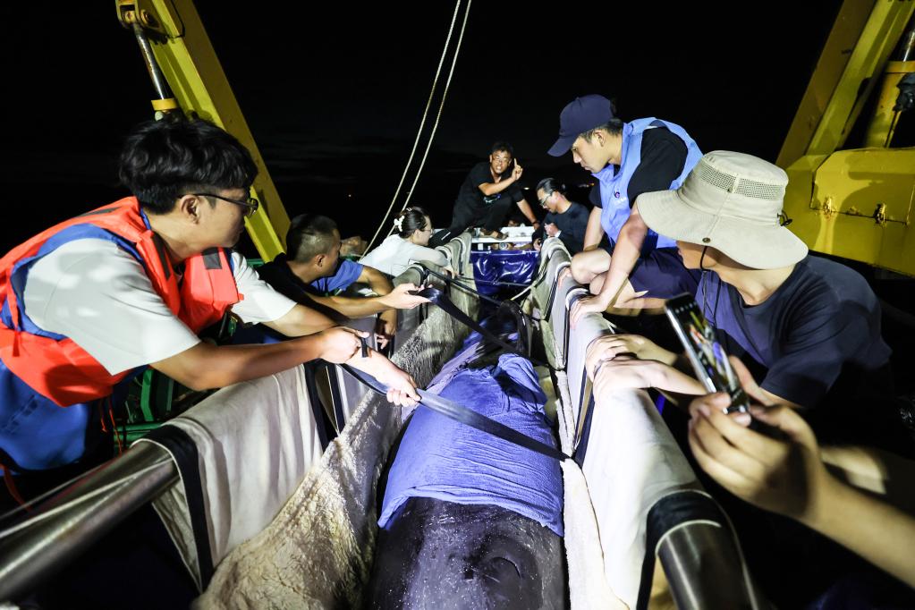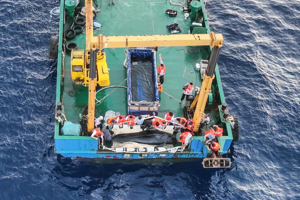 5月25日,在“利洋358”科考船上,大家给短肢领航鲸“海棠”调整位置,防止其侧翻。