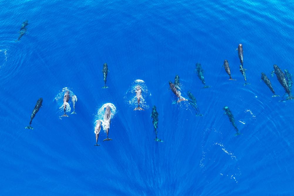 7月6日,一群短肢领航鲸在海南岛东部海域畅游(无人机照片)。