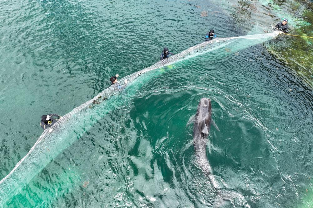 5月25日,在三亚海昌生物保育中心,潜水员用拉网准备转移短肢领航鲸“海棠”。