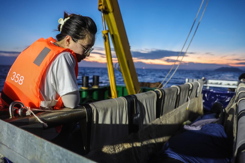 凌晨4点,驾驶室内发出通知。刚刚还躺在船舱地板上休息的人们又忙碌了起来——调整吊机位置,做放归前的最后准备。凌晨5点多,海面迎来了第一缕曙光,天被染成了淡紫色。工作人员紧张地反复确认着“海棠”的身体状况。