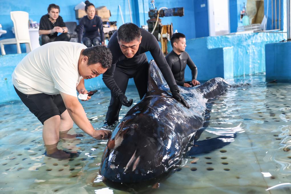 1月9日,三亚海昌生物保育中心的兽医熊椿霖(左一)在志愿者的协助下对短肢领航鲸“海棠”进行治疗。