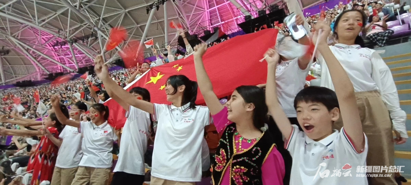 杭州亚运会期间,参加“小小石榴籽 同心享亚运”公益活动的新疆孩子们在杭州奥体中心体育场观赛。 石榴云/新疆日报记者 任江摄
