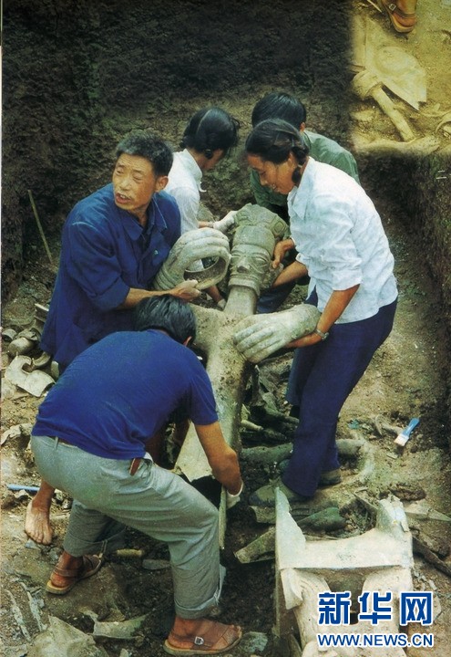 青铜大立人出土照片。(资料照片)