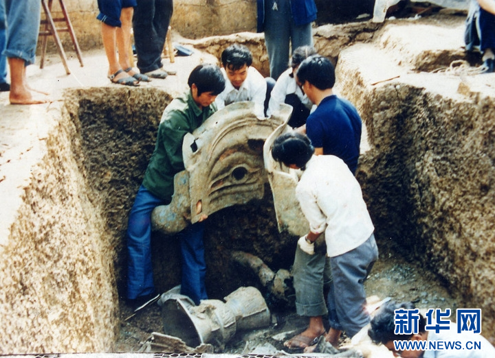 青铜纵目面具出土照片。(资料照片)