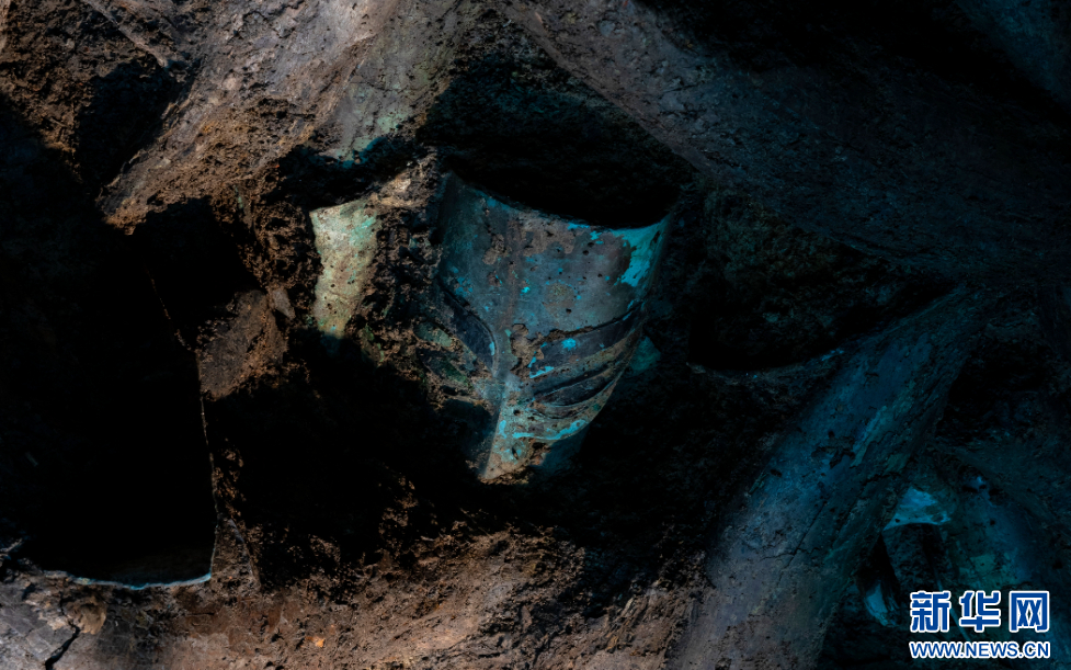 这是在三星堆遗址考古发掘现场3号“祭祀坑”拍摄的青铜面具。新华社记者 沈伯韩 摄