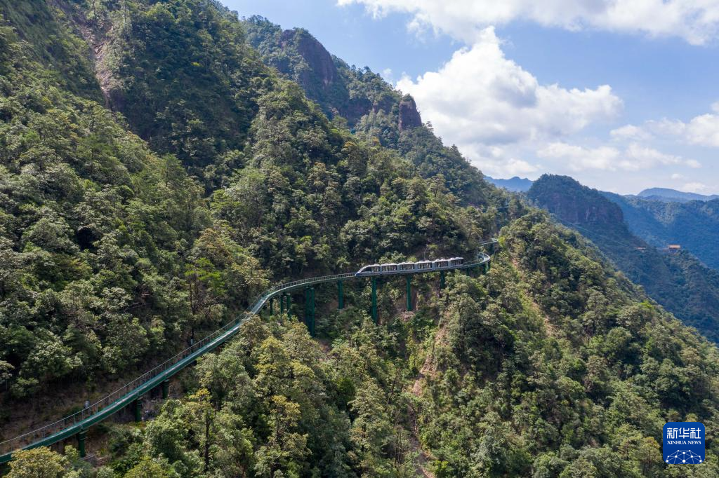 7月11日,“悬崖动车”行驶在江西大觉山景区。新华社记者 郭杰文 摄