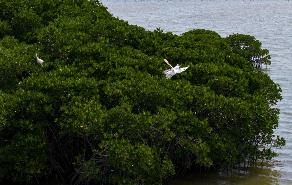 这片“绿岛”所在的湛江红树林国家级自然保护区,是中国红树林面积最大、分布最集中的自然保护区。站在岸边眺望,成群的白鹭盘桓于蓝天碧海间,偶有游船划过,一转眼便消失在红树林深处。