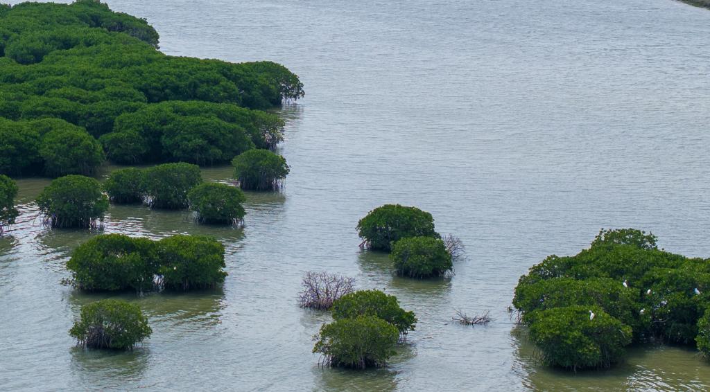 在广东湛江金牛岛红树林片区,成片低矮的树木团簇在一起,树根扎入浅海中隆起的淤泥,紧紧相拥的枝叶在风中轻轻摇曳。从远处看,波光粼粼的海面上好像漂浮着一座座绿色小岛。