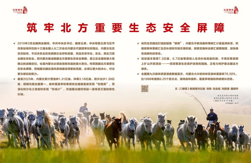 牢记嘱托,勇担责任。2023年10月,《国务院关于推动内蒙古高质量发展奋力书写中国式现代化新篇章的意见》发布,其中围绕“统筹山水林田湖草沙系统治理,筑牢北方重要生态安全屏障”,提出了科学推进荒漠化综合治理、强化草原森林湿地保护修复等4项意见,为内蒙古构筑祖国北疆万里绿色长城提供了国家关怀和政策支持。
