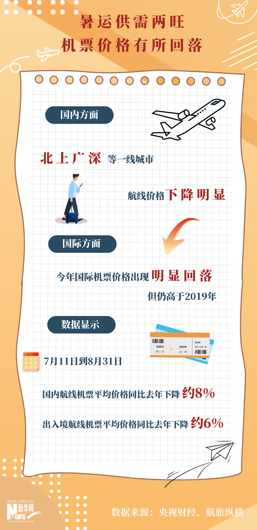 今年民航暑运呈现出“供需两旺”的格局,国内及国际机票价格都有一定的回落。