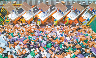 图为江苏省宿迁经济技术开发区邮政邮件处理中心,工作人员在进行分拣。陈少帅摄(影像中国)
