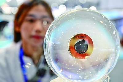 安徽合肥,观众在科普展览上观察月壤。新华社发