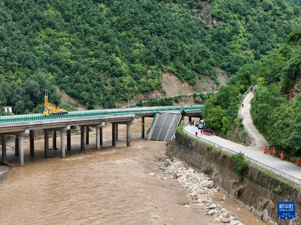 7月20日在陕西省商洛市柞水县境内拍摄的丹宁高速水阳段山阳方向K46+200处严坪村二号桥垮塌现场(无人机照片)。新华社记者 赵英博 摄