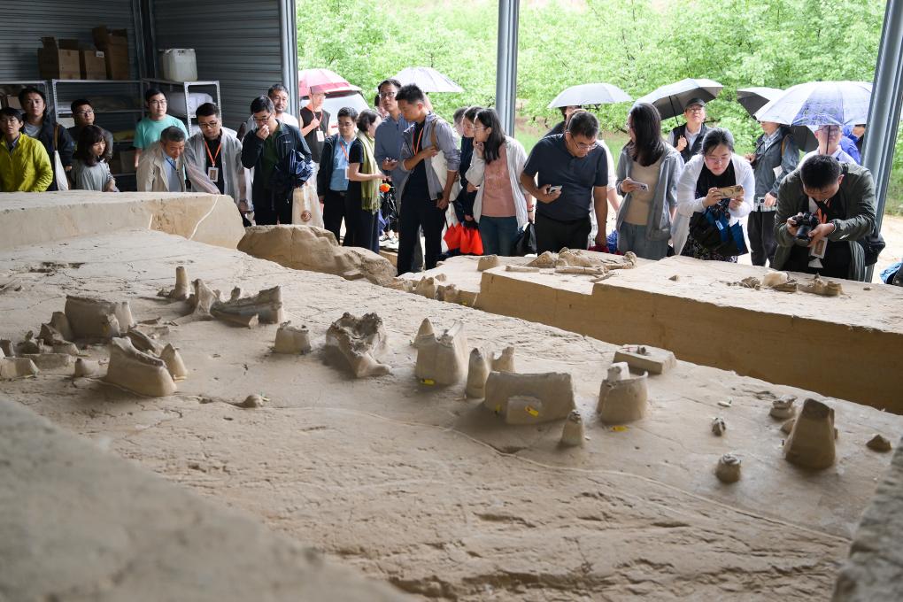 专家学者来到位于阳原县的泥河湾国家考古遗址公园内对石沟遗址地层及现场保存遗物进行学术考察(2023年7月30日摄)。