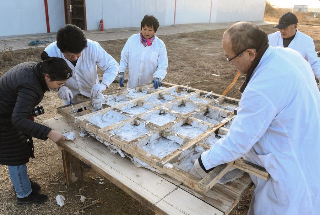 考古工作者利用石膏、木架、薄荷醇等材料将车轮固定后提取出来在室外进行清理(2018年12月4日摄)。