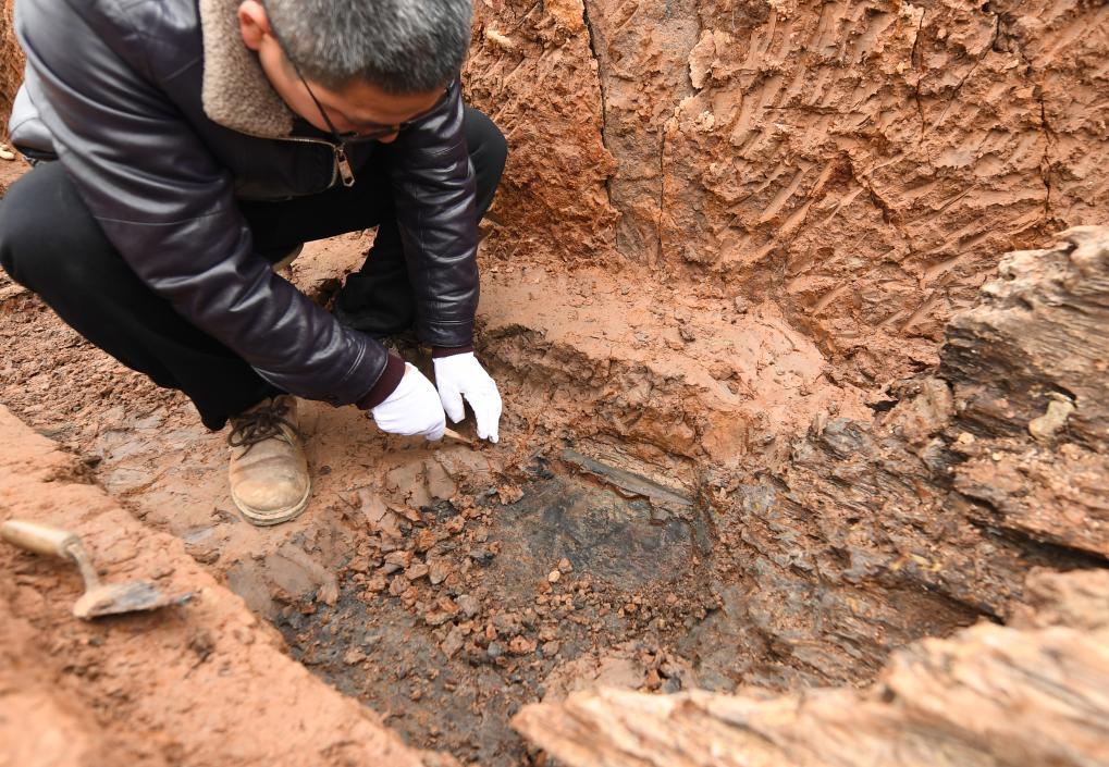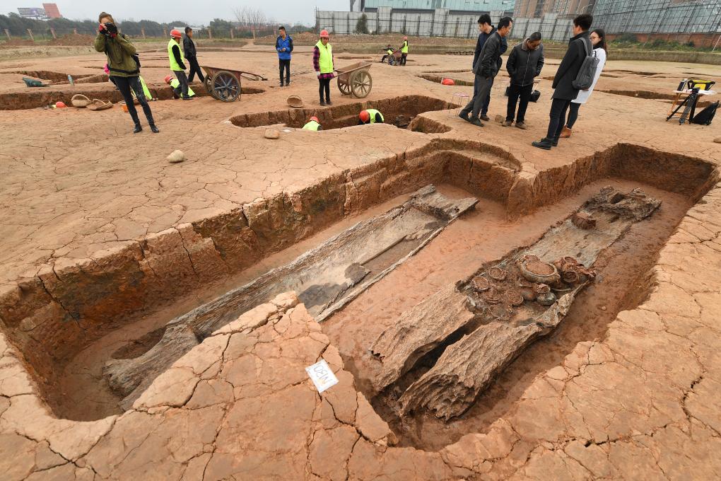 在成都蒲江县的大型船棺墓群发掘现场,依稀可见放置在巨大的船棺遗迹中随葬物品(2017年3月1日摄)。