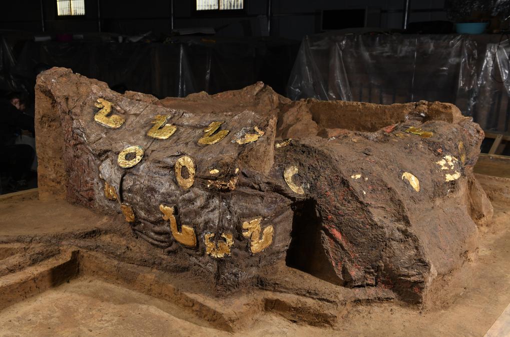 经过对车轮的揭取后,车厢表面显露出髹漆层以及镶嵌着若干贴有金箔饰片的金属兽形牌饰(2018年12月4日摄)。