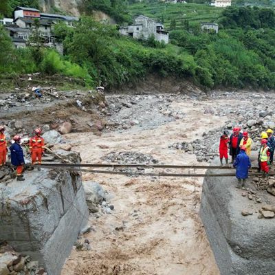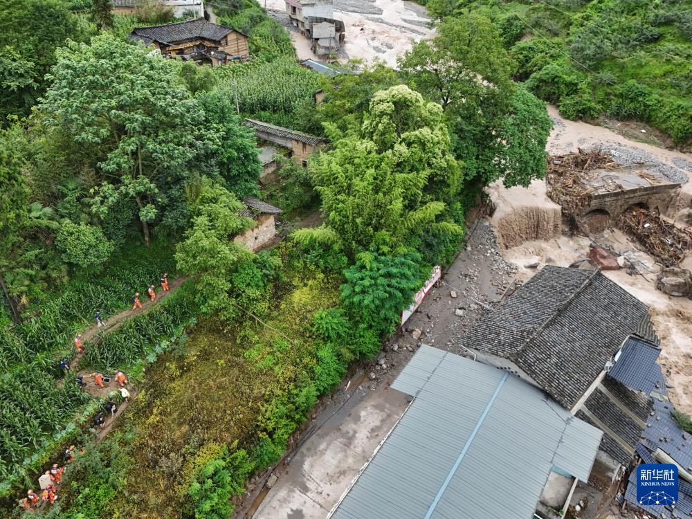 7月20日,四川省雅安市汉源县马烈乡遭遇山洪暴雨灾害。这是7月21日,救援人员在马烈乡新华村进行搜救(无人机照片)。