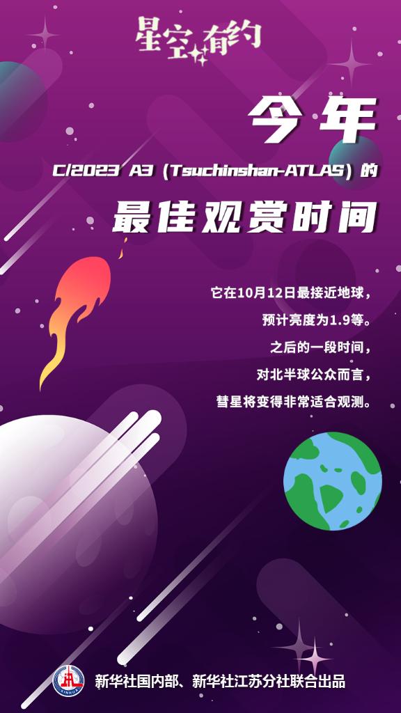 C/2023 A3(Tsuchinshan-ATLAS)于2023年被发现,是中国科学院紫金山天文台发现的第8颗彗星,中文名为紫金山-阿特拉斯彗星。“它是一颗逆行轨道彗星,其轨道平面和黄道面的夹角约49度。”紫金山天文台研究员赵海斌说,当前,这颗彗星正朝着近日点方向运动,预计将于北京时间9月28日凌晨通过近日点,届时与太阳的距离是0.39个天文单位,在10月12日最接近地球,距离地球约0.47个天文单位。