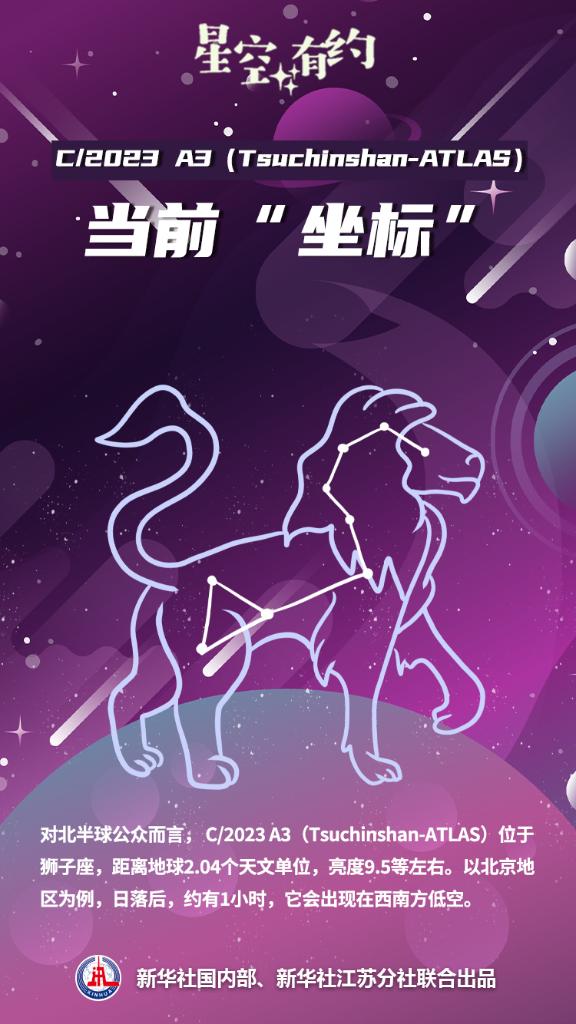 中国科学院紫金山天文台科普主管王科超介绍,对北半球公众而言,当前C/2023 A3(Tsuchinshan-ATLAS)位于狮子座,距离地球有2.04个天文单位,亮度在9.5等左右。以北京地区为例,日落后,约有1小时,它会出现在西南方低空,感兴趣的公众可借助天文望远镜观测到它,或是借助相机长时间曝光来尝试拍摄。大约21时,它会落到地平线以下。