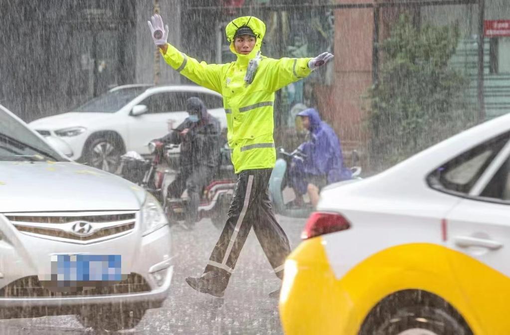 图为一名交警在雨中指挥交通。(沈阳市公安局交通警察局供图)