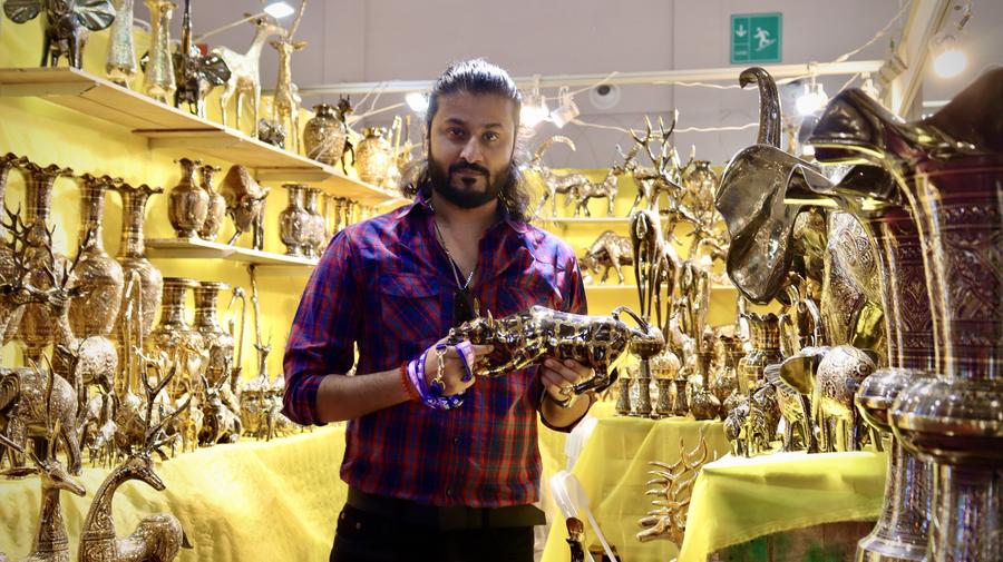巴基斯坦参展商阿基夫带来了许多精美的铸铜雕刻手工艺品,既有各类花瓶造型,也有各种动物造型。“今年是龙年,我的铜龙制品最好卖,现在已经卖断货了。”了解到中国的十二生肖文化后,阿基夫特地设计制作了十二生肖铜制品,带到中国来卖。