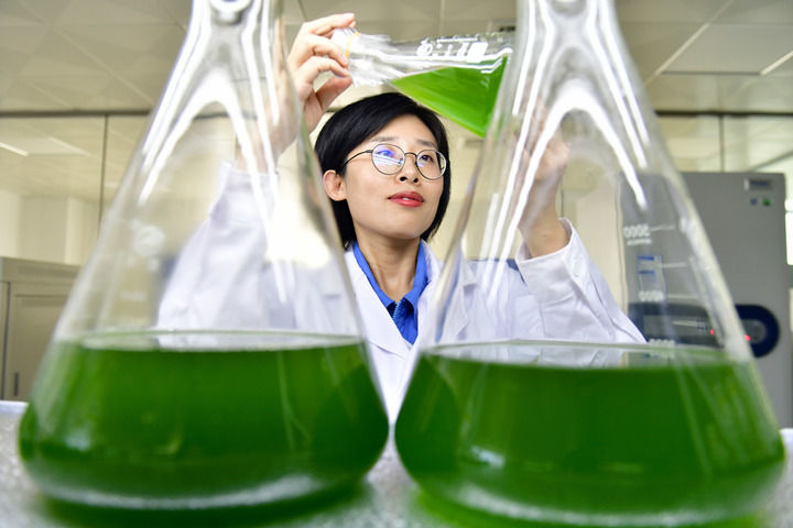 2024年7月4日,在青岛琅琊台集团海洋微藻实验室,工作人员查看小球藻的生长状况。新华社记者 郭绪雷 摄