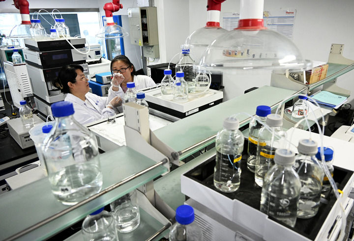 青岛海洋生物医药研究院研究人员在实验室进行研发测试(2024年6月7日摄)。新华社记者 李紫恒 摄