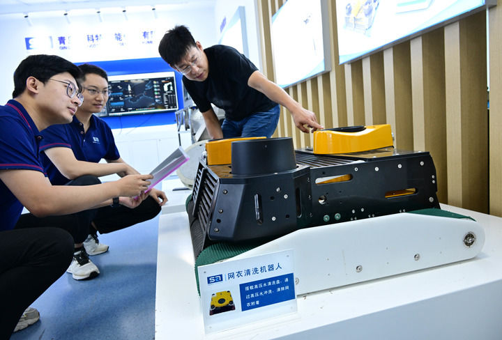 2024年7月11日,青岛森科特智能仪器有限公司科研人员(右一)在介绍网衣清洗机器人水下工作原理。新华社记者 李紫恒 摄